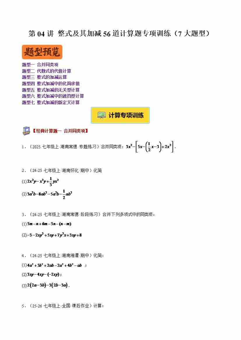专题04 整式及其加减56道计算题专项训练(7大题型)(学生版)