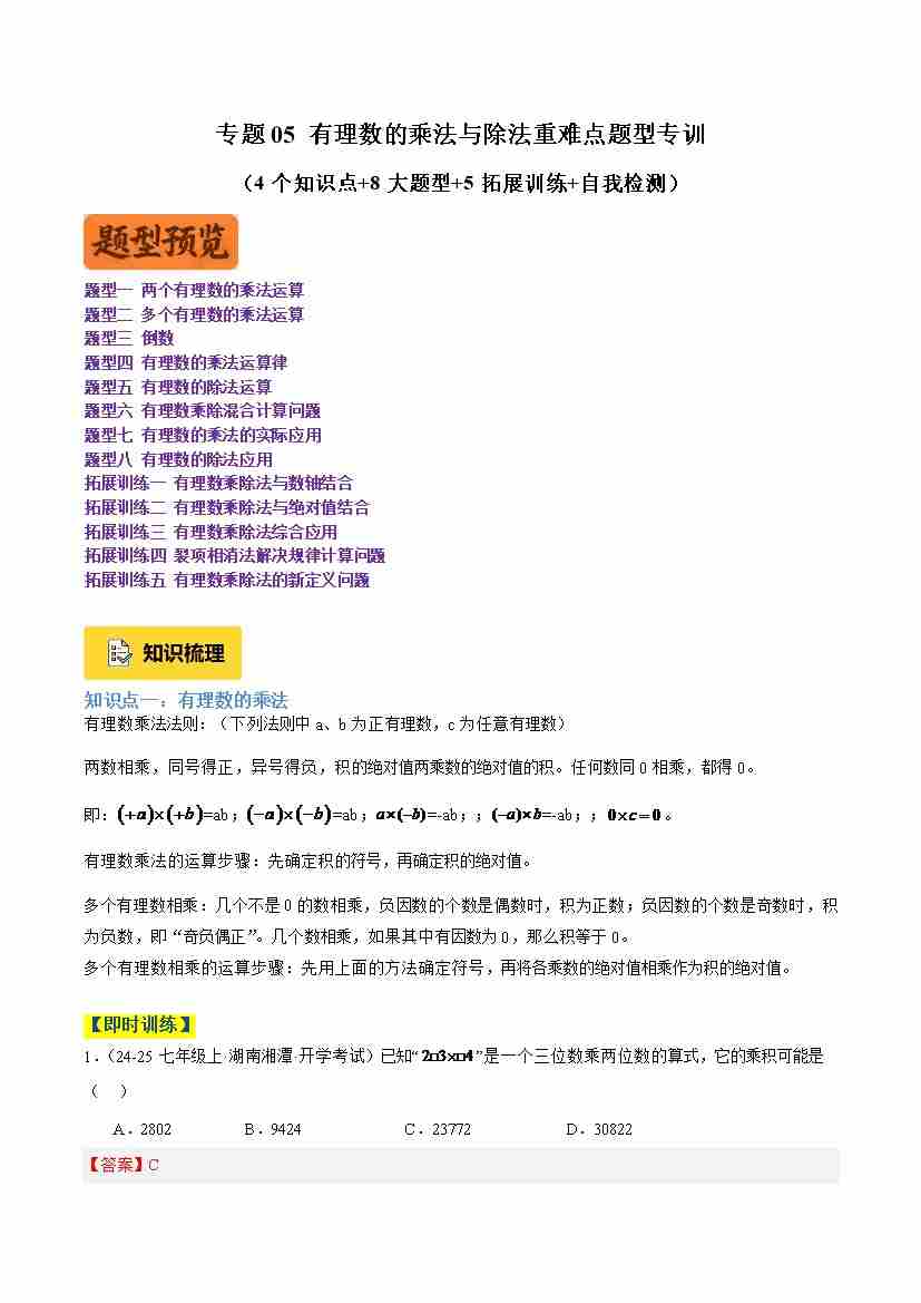 专题05 有理数的乘法与除法重难点题型专训(4个知识点 8大题型 5大拓展训练 自我检测)(学生版)