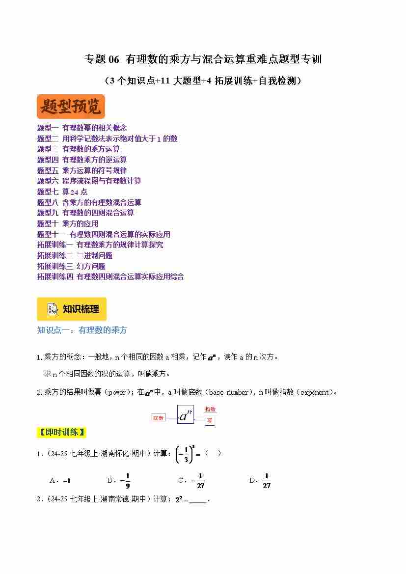专题06 有理数的乘方与混合运算重难点题型专训(3个知识点 11大题型 4大拓展训练 自我检测)(学生版)