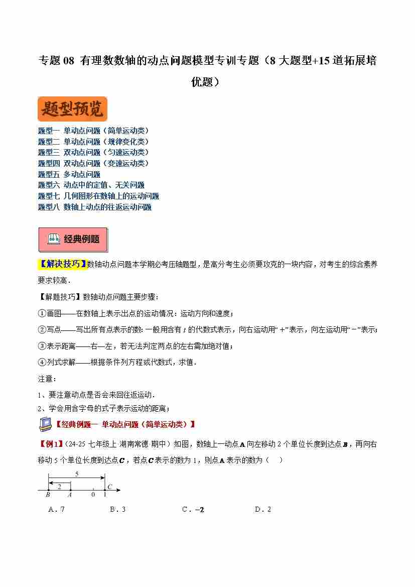 专题08 有理数数轴上的动点问题模型专训(8大题型 15道拓展培优题)(学生版)