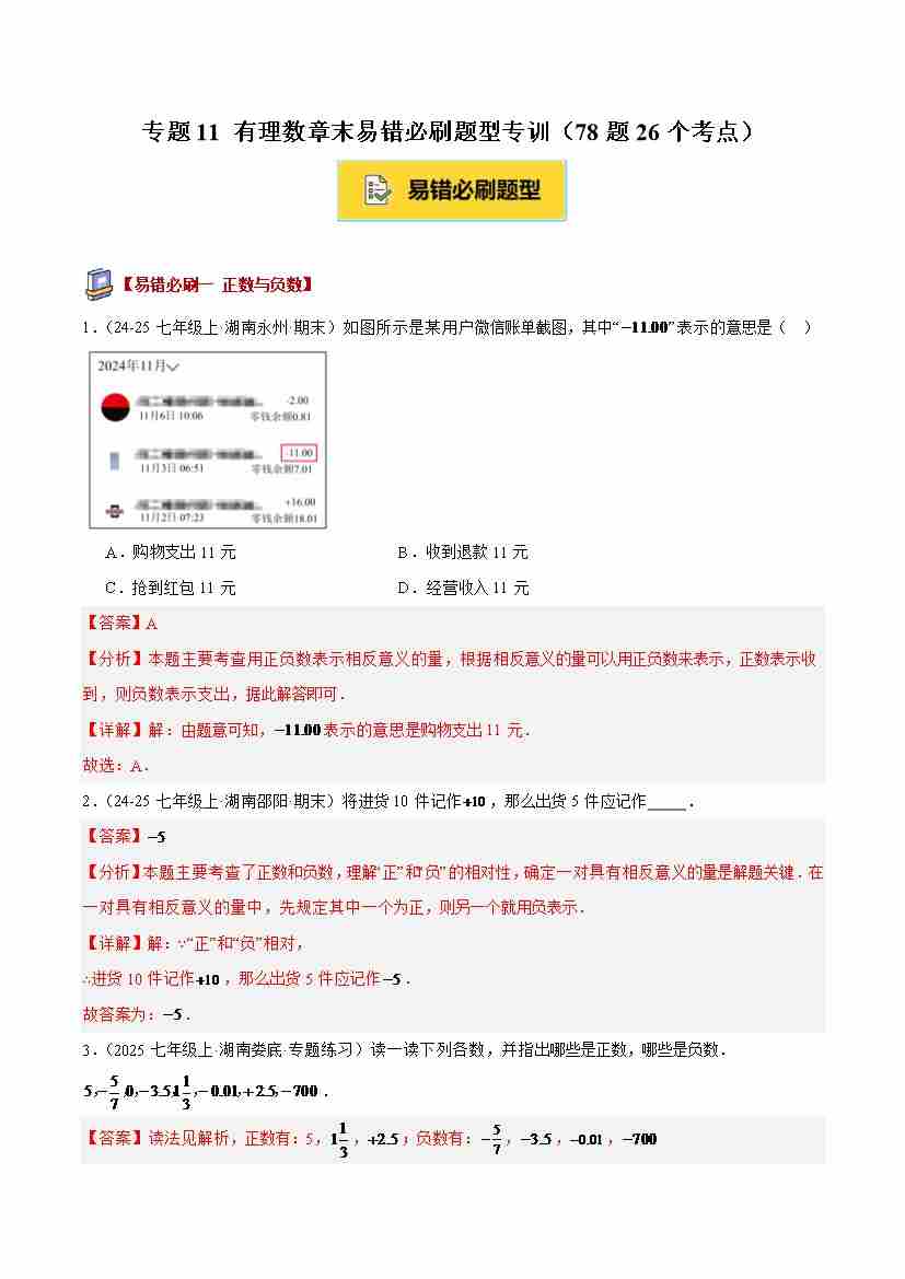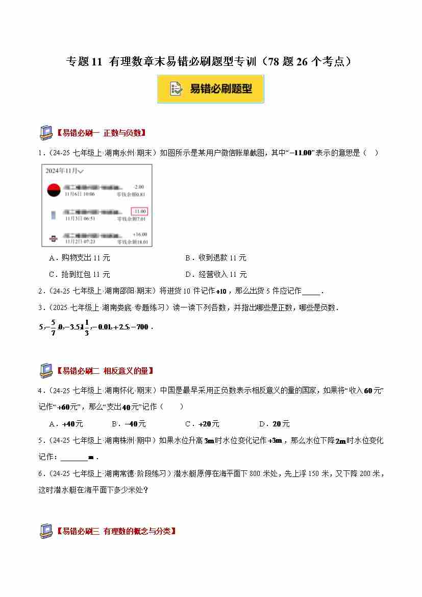 专题11 有理数章末易错必刷题型专训(78题26个考点)(学生版)