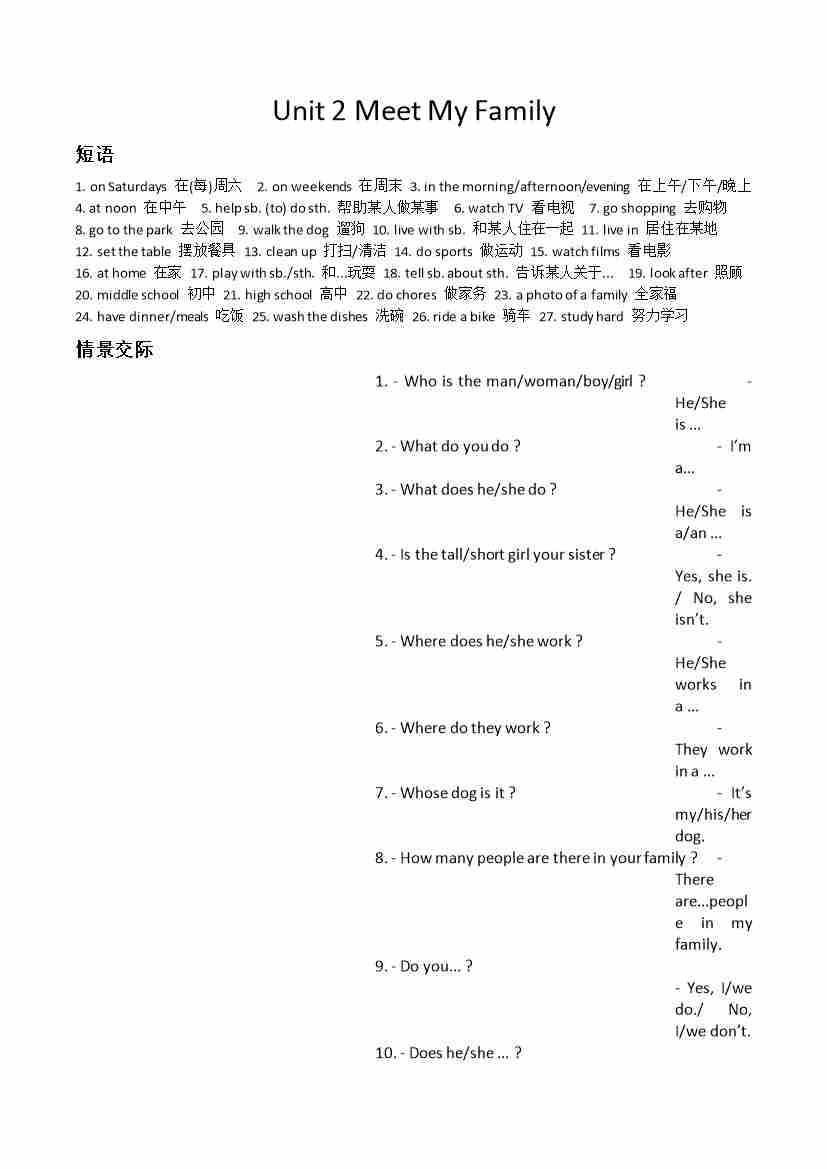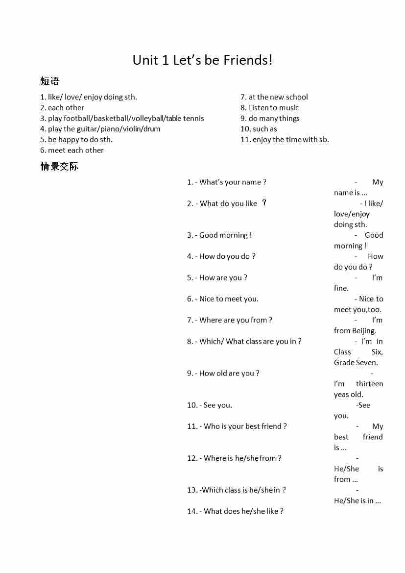 Unit 2 Wrapping Up the Topic 知识清单仁爱科普版英语七年级上册