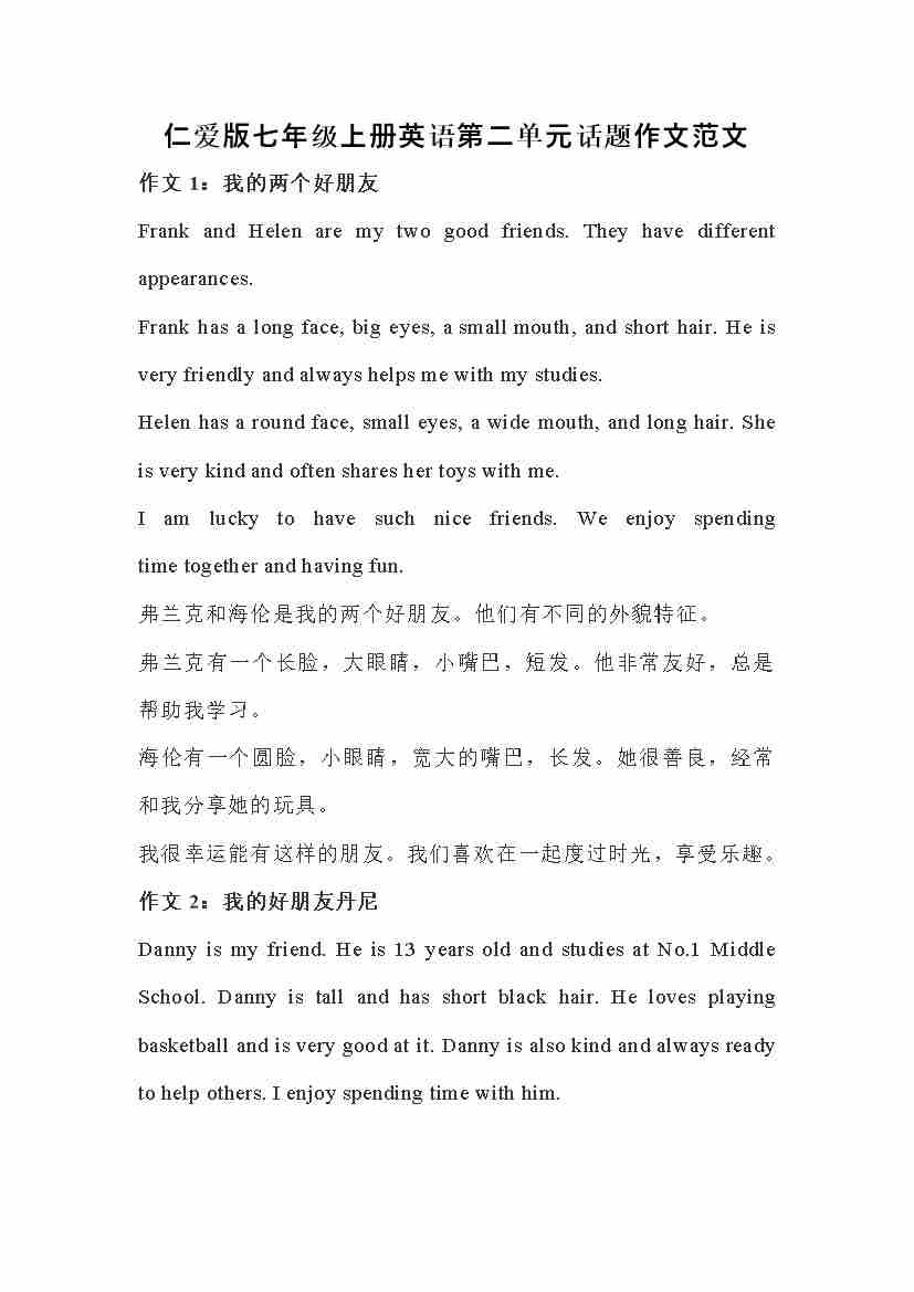 Unit 2 单元话题作文范文仁爱科普版(2024)七年级英语上册