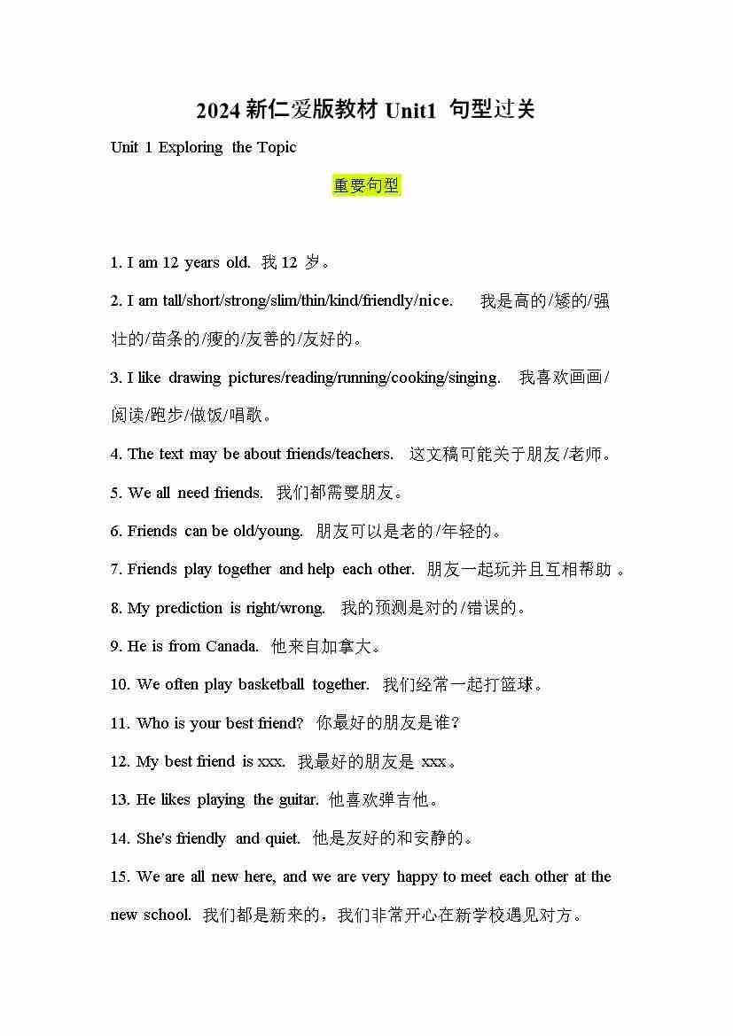Unit 1 重点句 仁爱科普版(2024)七年级英语上册