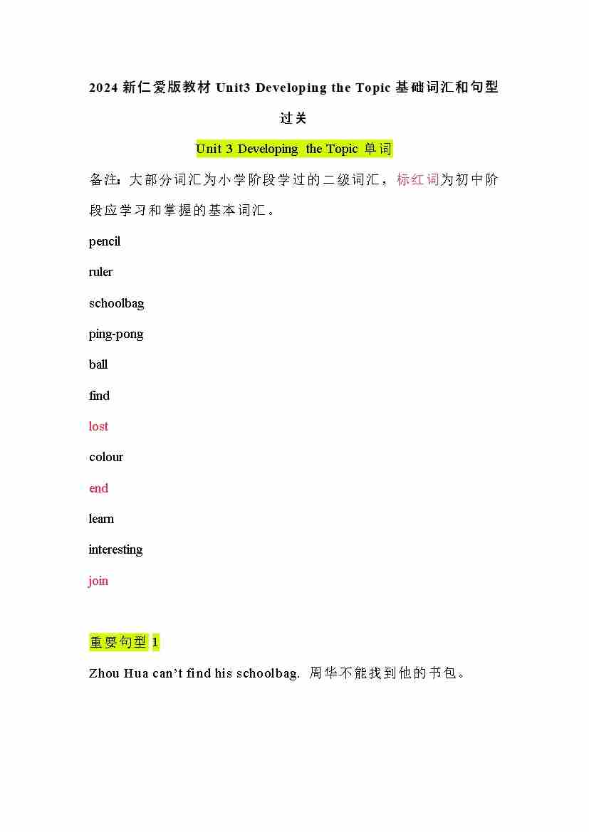 Unit3 Developing the Topic基础词汇和句型过关仁爱科普版(2024)七年级英语上册