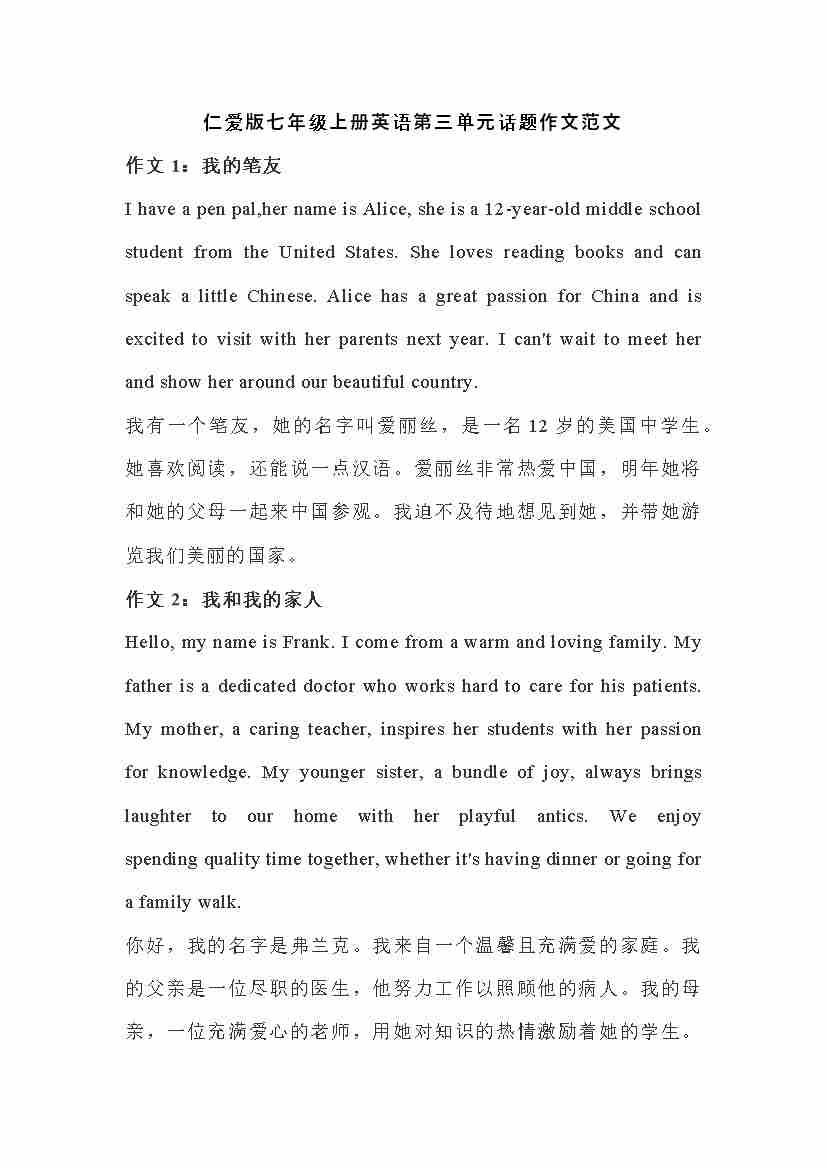 Unit3单元话题作文范文仁爱科普版英语七年级上册