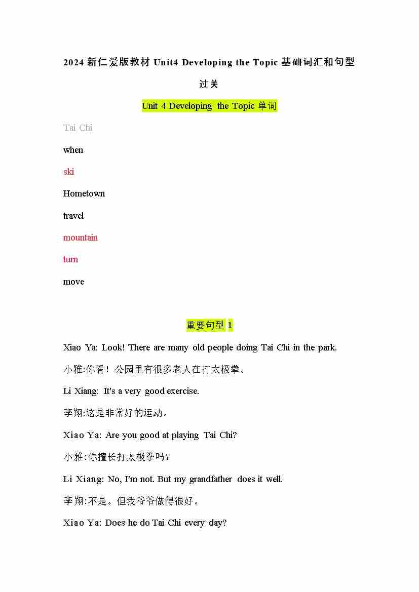 Unit4 Developing the Topic基础词汇和句型过关仁爱科普版(2024)七年级英语上册
