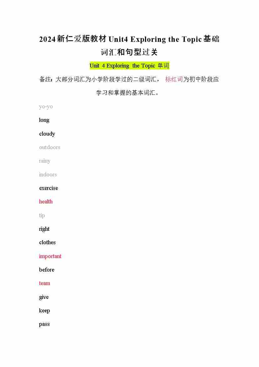Unit4 Exploring the Topic基础词汇和句型过关 -仁爱科普版(2024)英语七年级上册