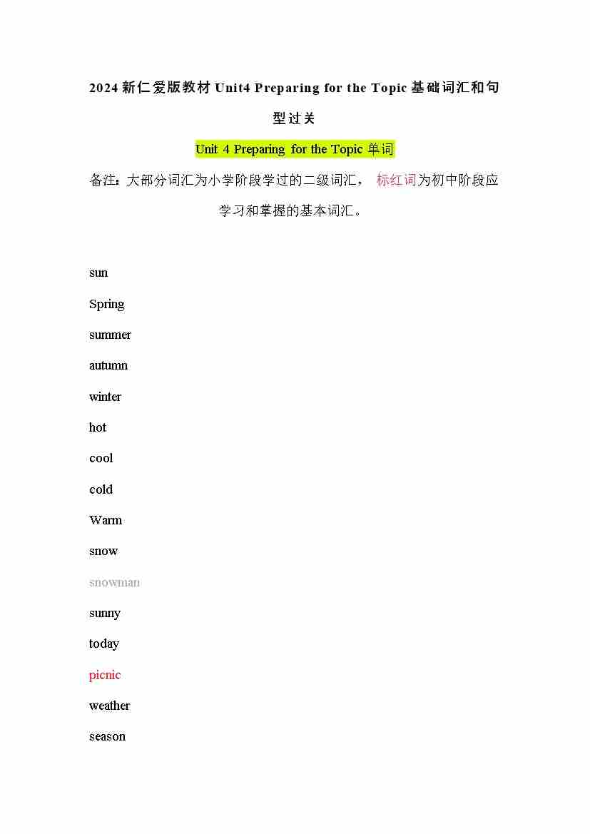 Unit4 Preparing for the Topic基础词汇和句型过关仁爱科普版(2024)七年级英语上册