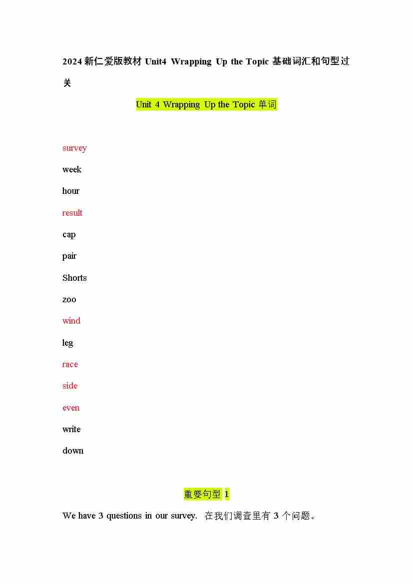 Unit4 Wrapping Up the Topic基础词汇和句型过关 仁爱科普版(2024)七年级英语上册