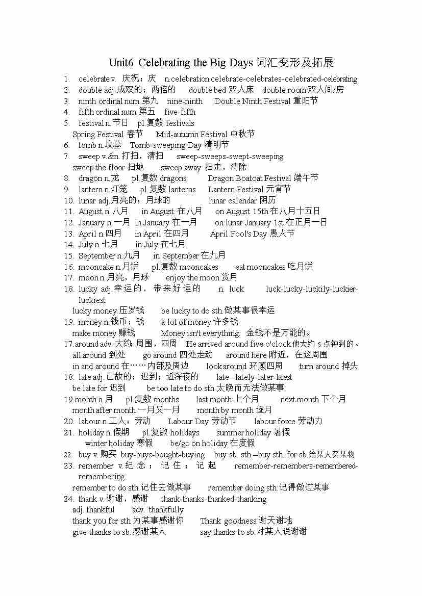 Unit6 Celebrating the Big Days词汇变形及拓展 仁爱科普版(2024)七年级英语上册