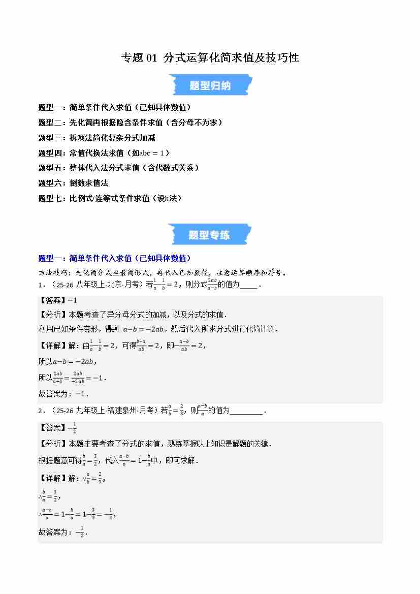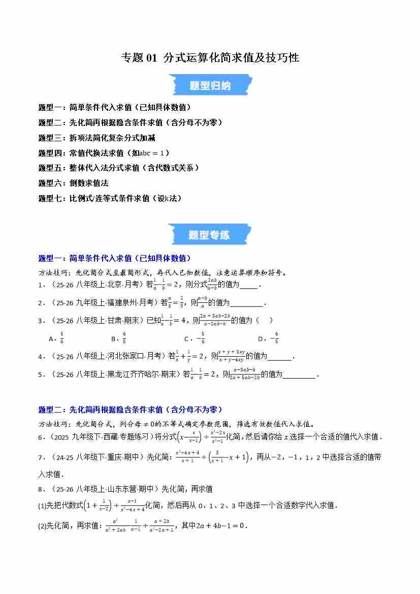专题01 分式运算化简求值及技巧性(高效培优专项训练)(原卷版)