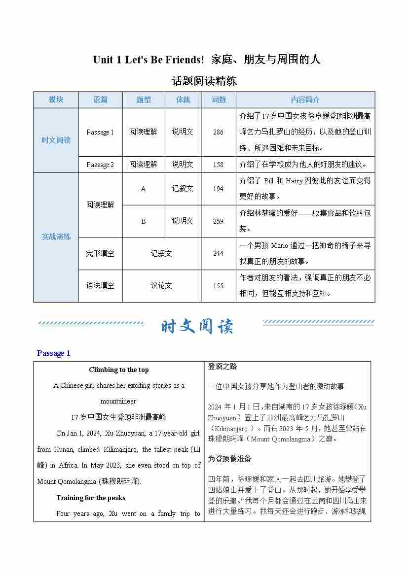 Unit 1 Let's Be Friends! 家庭、朋友与周围的人(话题阅读精练)(学生版)