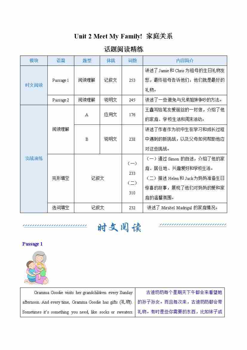 Unit 2 Meet My Family! 家庭关系(话题阅读精练)(教师版)