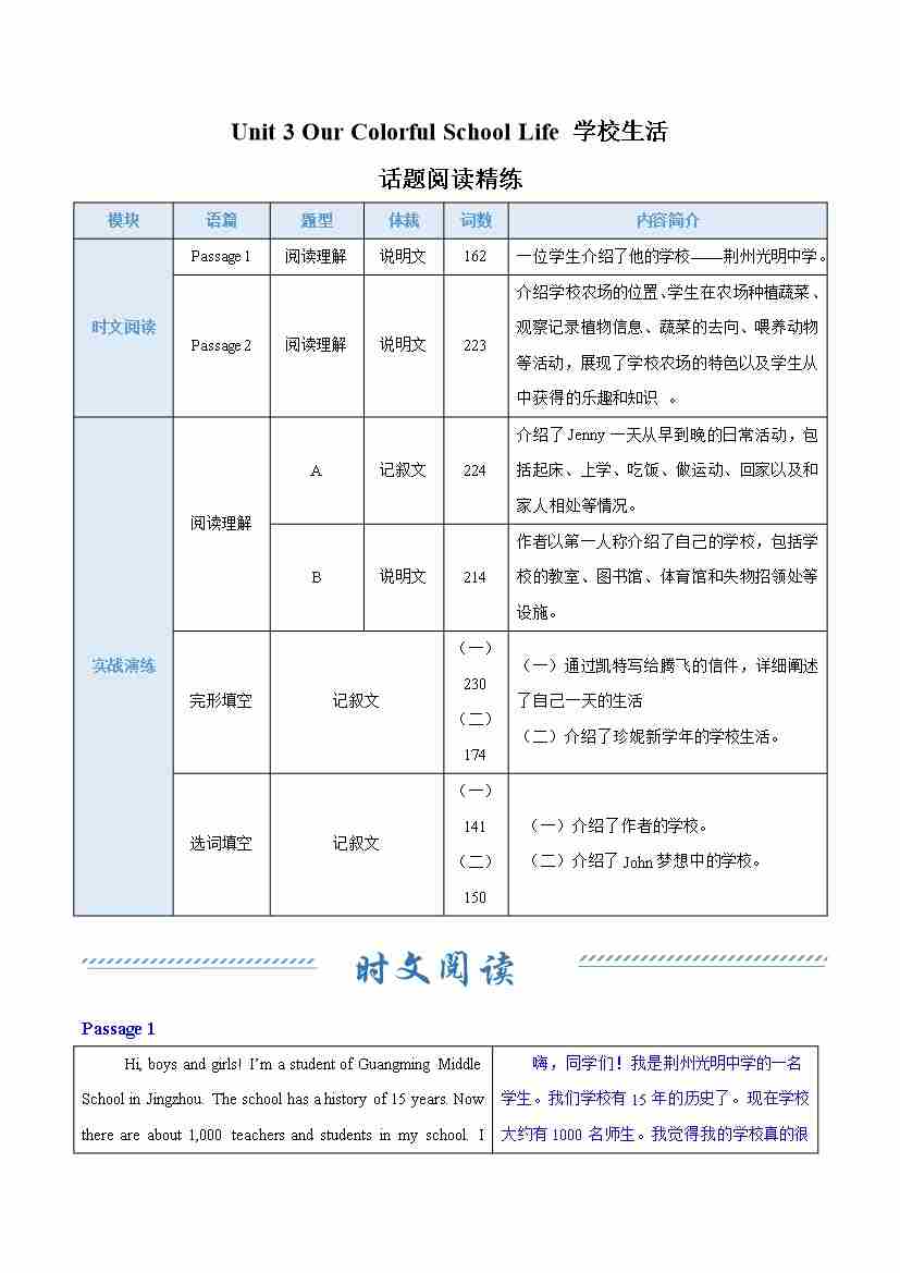 Unit 3 Our Colorful School Life 学校生活(话题阅读精练)(教师版)