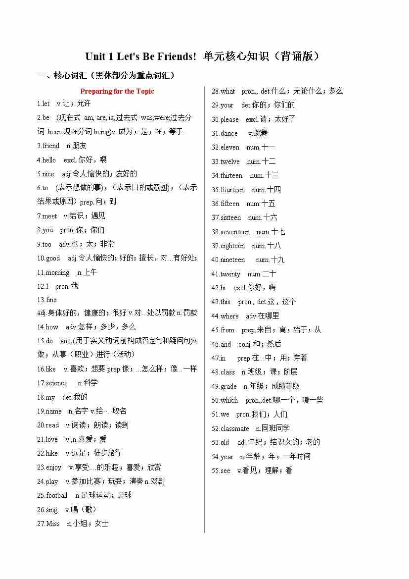 Unit 1 Let's Be Friends!(单元核心知识)(背诵版)