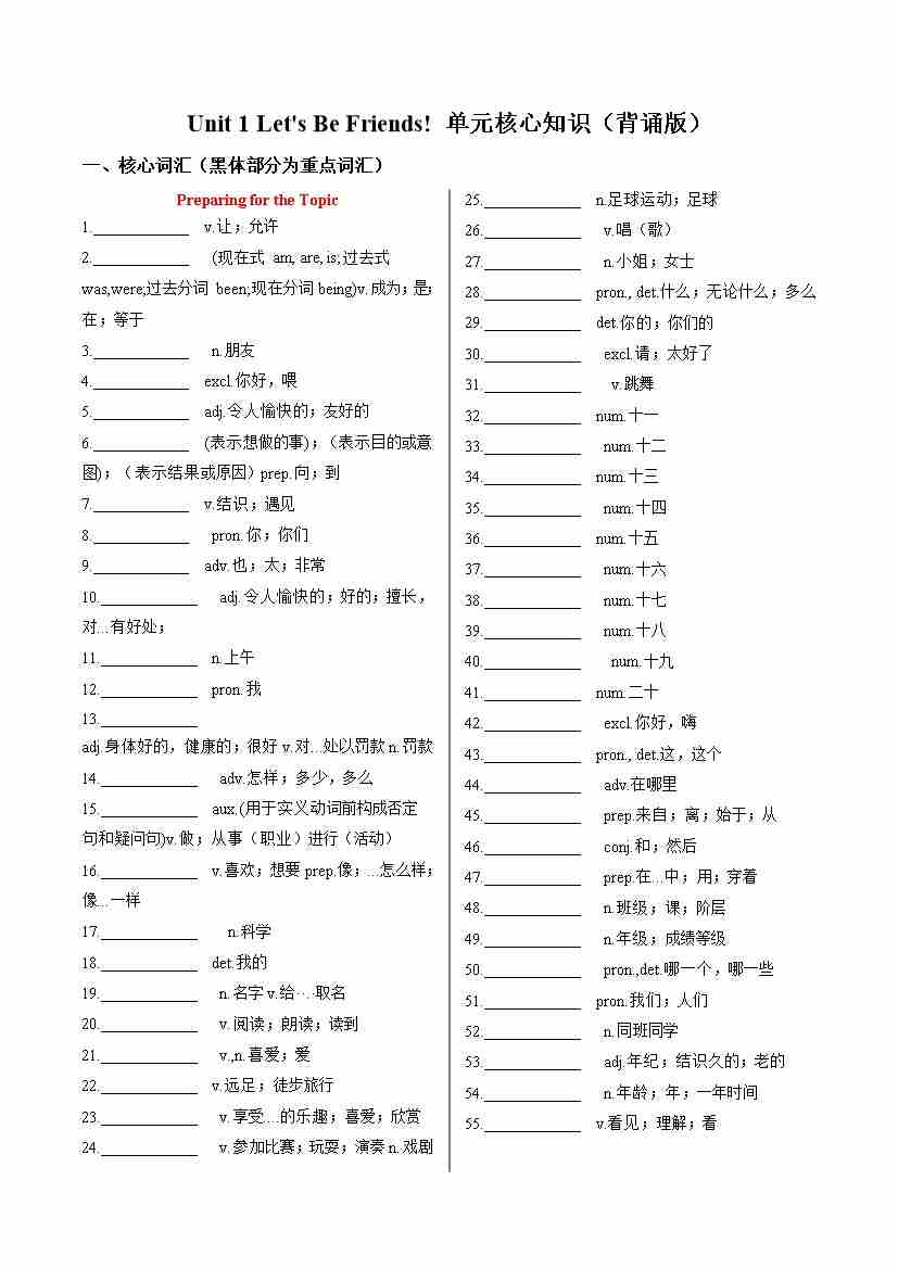 Unit 1 Let's Be Friends!(单元核心知识)(默写版)