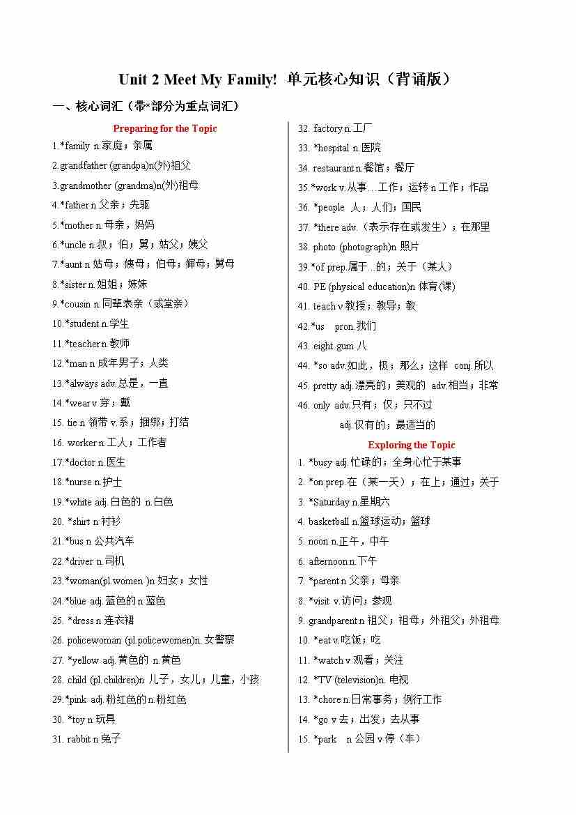 Unit 2 Meet My Family!(单元核心知识)(背诵版)