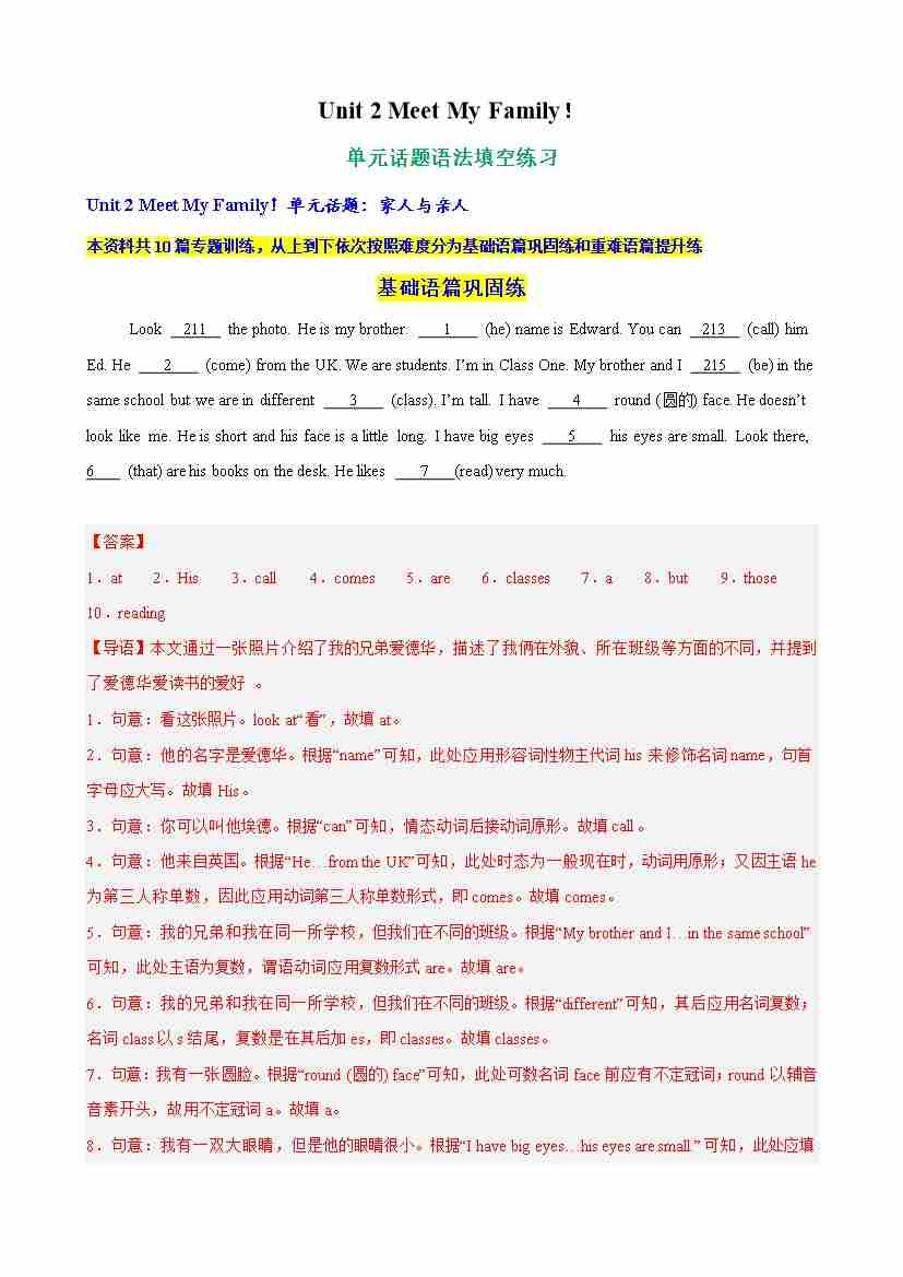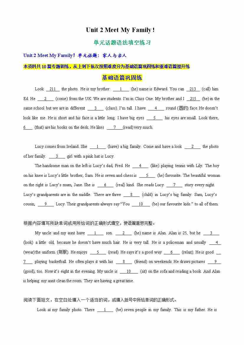 Unit 2 Meet My Family单元话题语法填空练习(教师版)