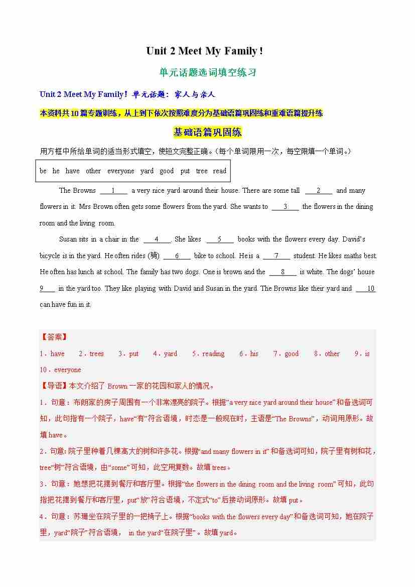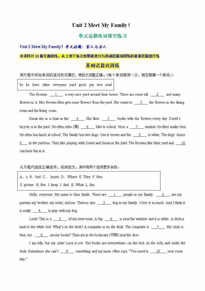 Unit 2 Meet My Family单元话题语法填空练习(学生版)
