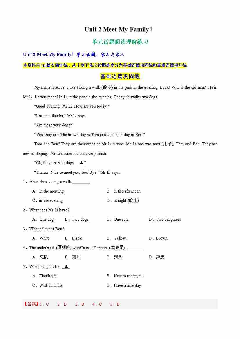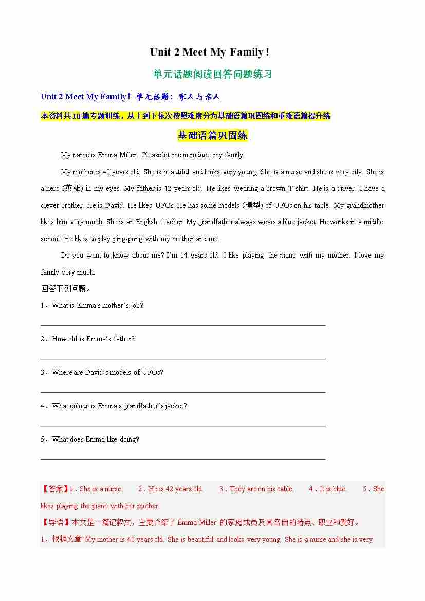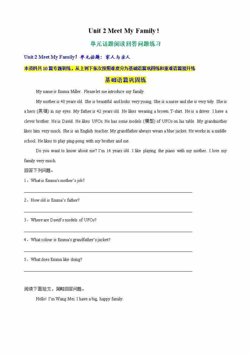 Unit 2 Meet My Family单元话题阅读回答问题练习(学生版)