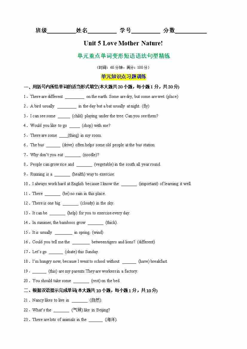Unit 5 Love Mother Nature!核心单词,词性转换,短语,语法,句型精练(学生版)
