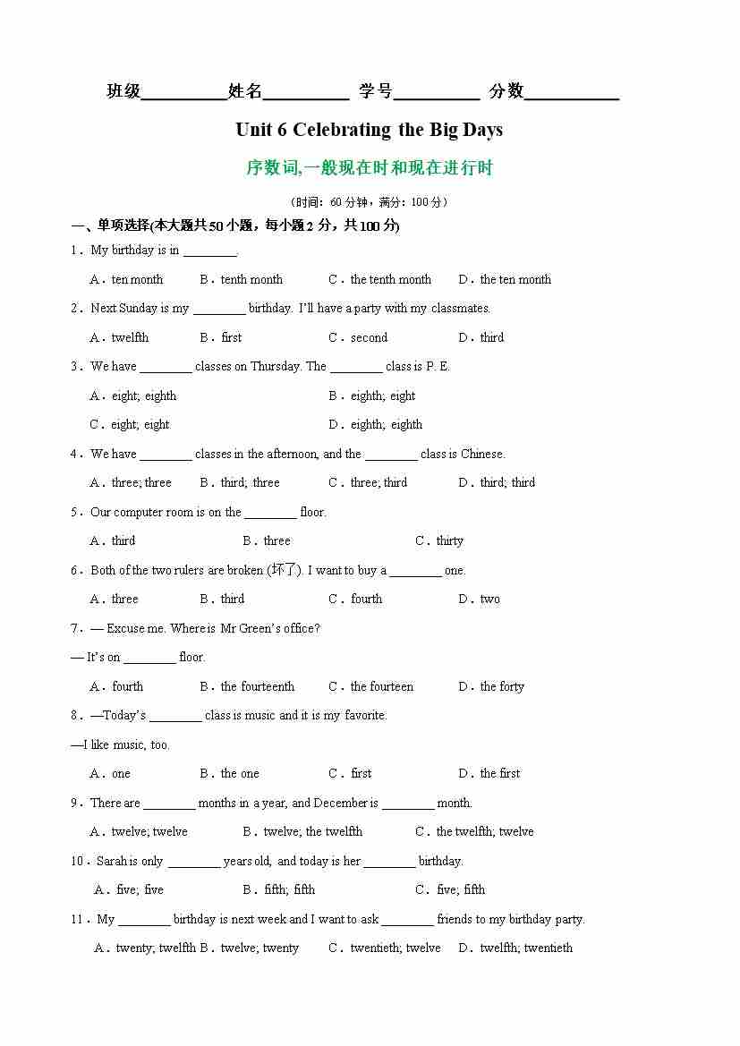 Unit 6 Celebrating the Big Days 语法Grammar 序数词,一般现在时和现在进行时单元重难点易错题精练
