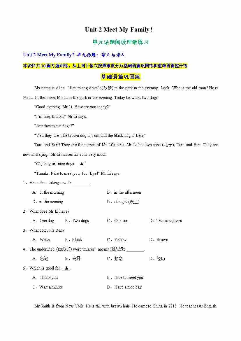 Unit 2 Meet My Family单元话题阅读理解练习(学生版)