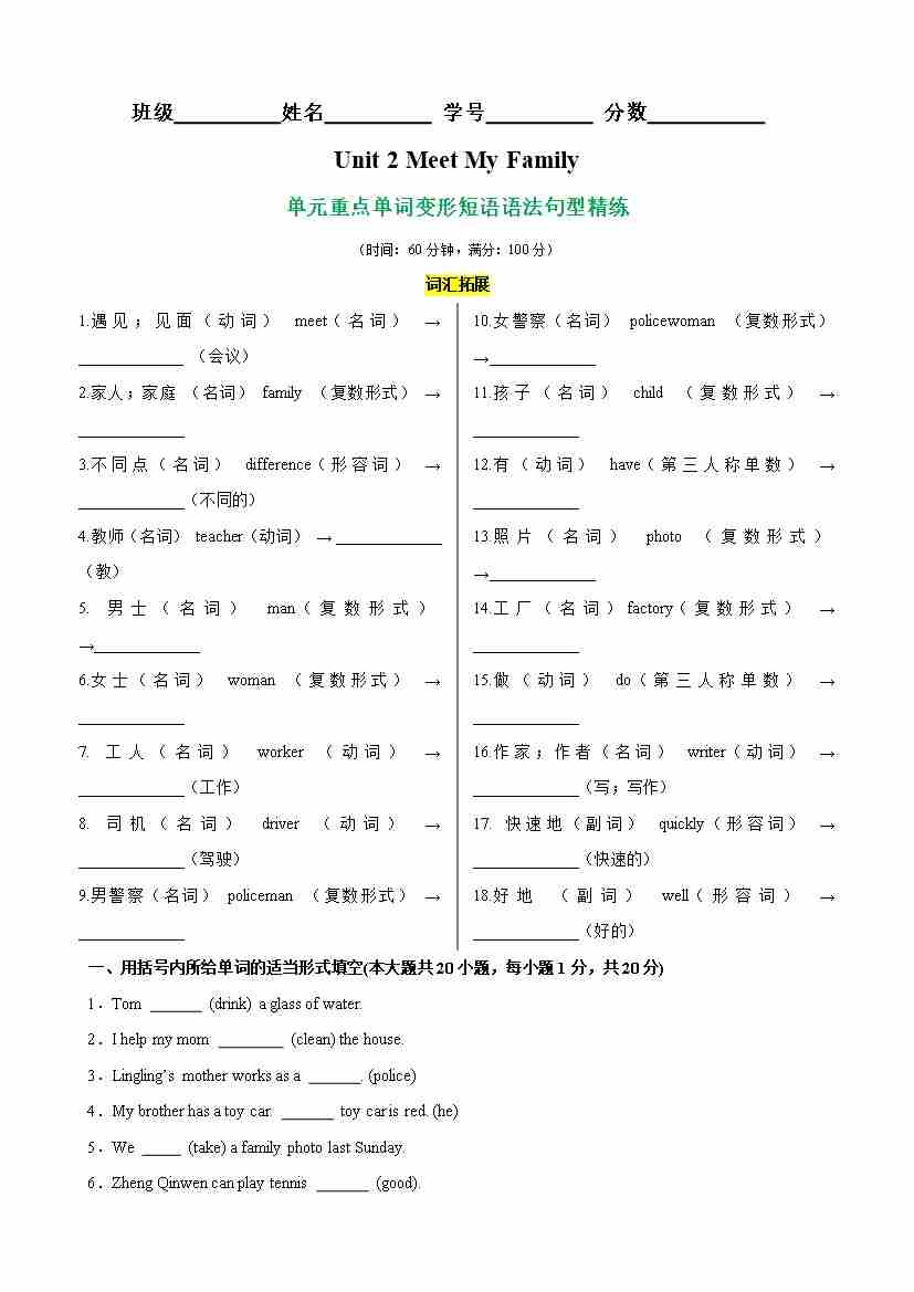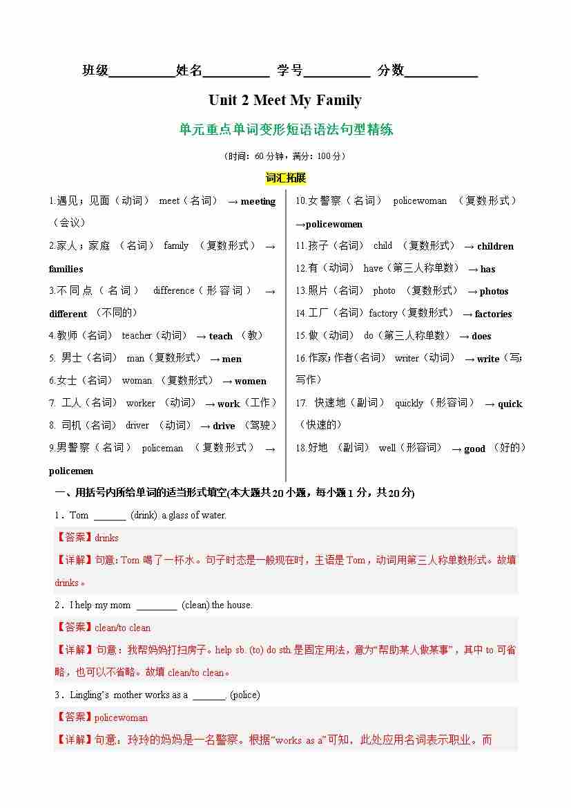 Unit 2 Meet My Family核心单词,词性转换,短语,语法,句型精练(教师版)