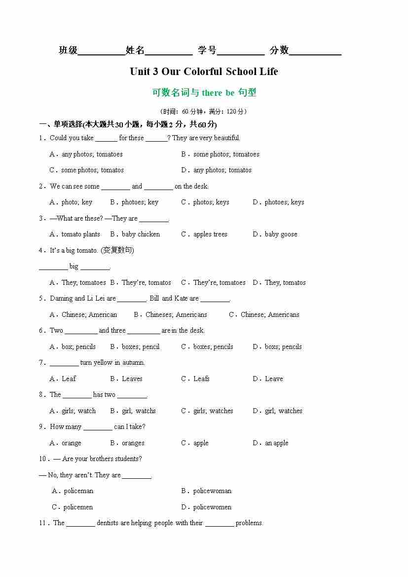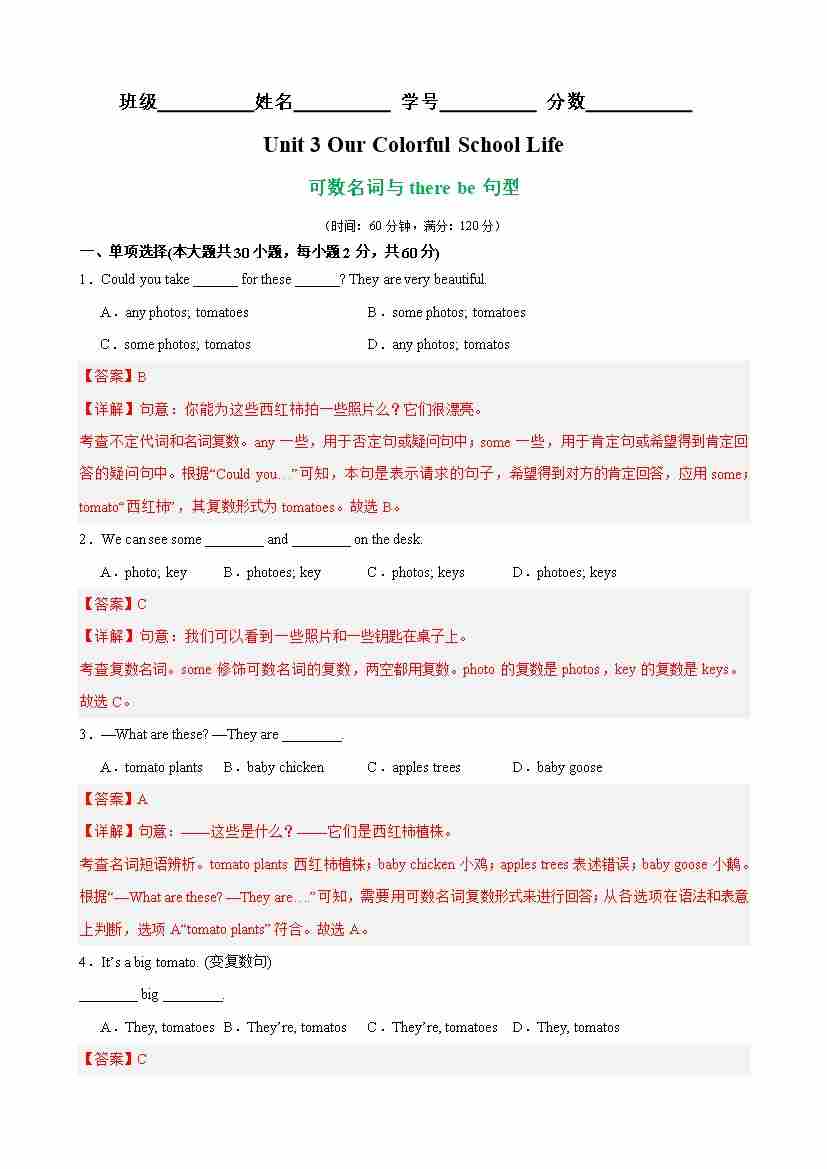 Unit 3 Our Colorful School Life 语法Grammar 可数名词与there be句型(教师版)