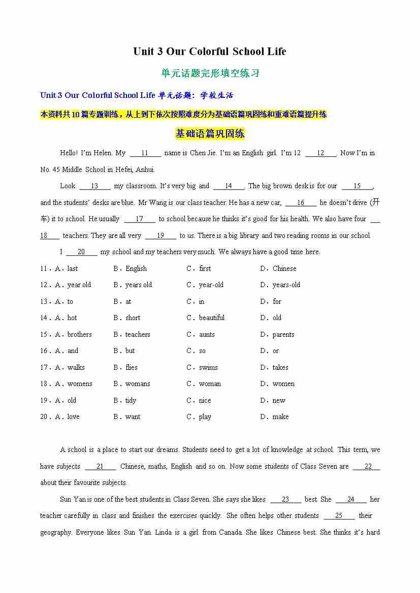 Unit 3 Our Colorful School Life单元话题完形填空练习(学生版)