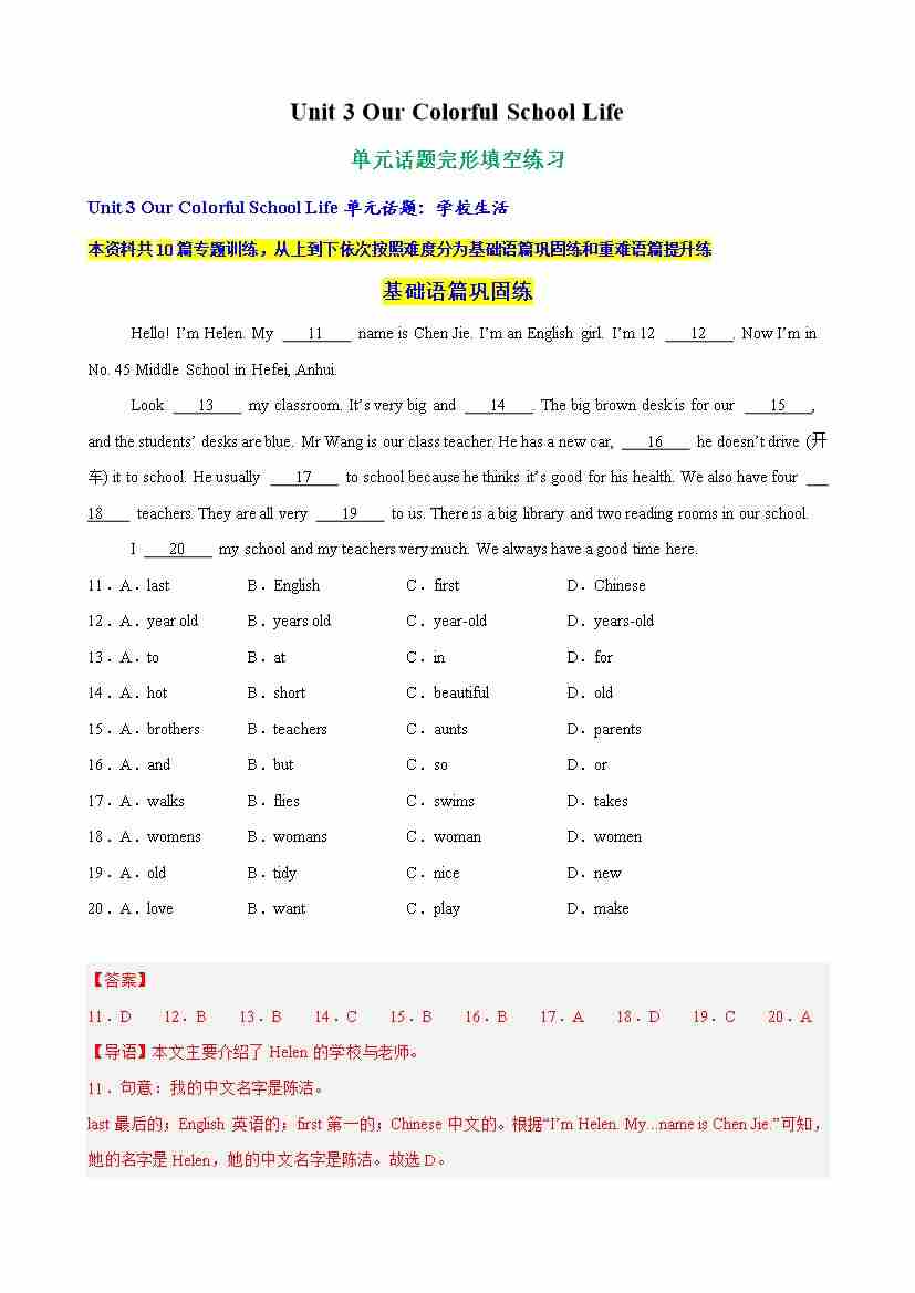Unit 3 Our Colorful School Life单元话题完形填空练习(教师版)