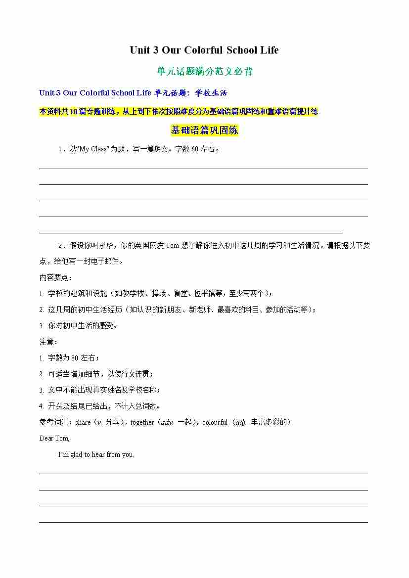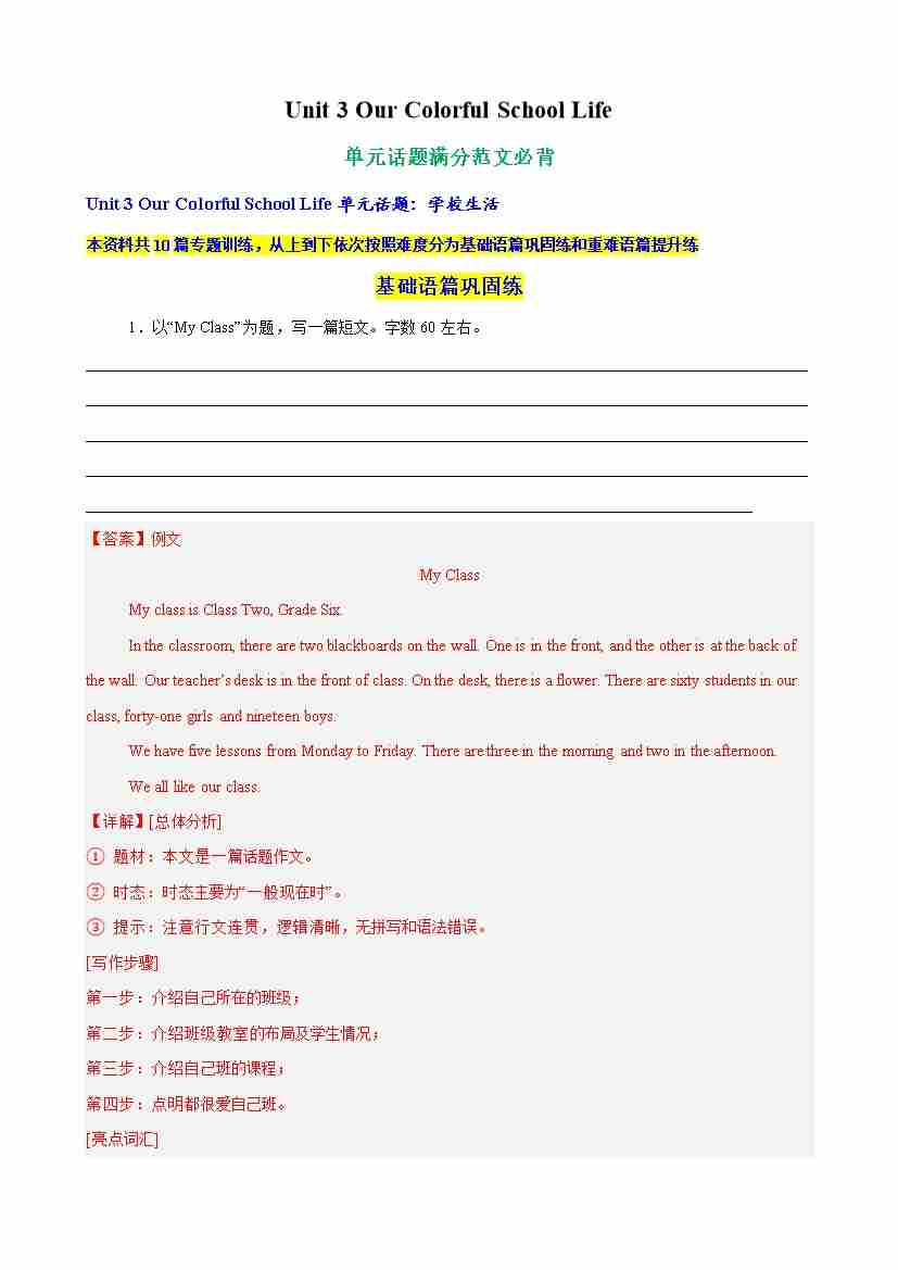 Unit 3 Our Colorful School Life单元话题满分范文必背(教师版)