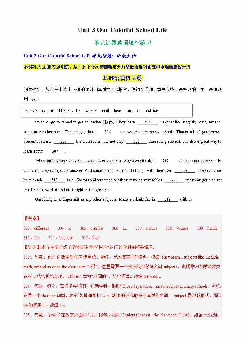 Unit 3 Our Colorful School Life单元话题选词填空练习(教师版)