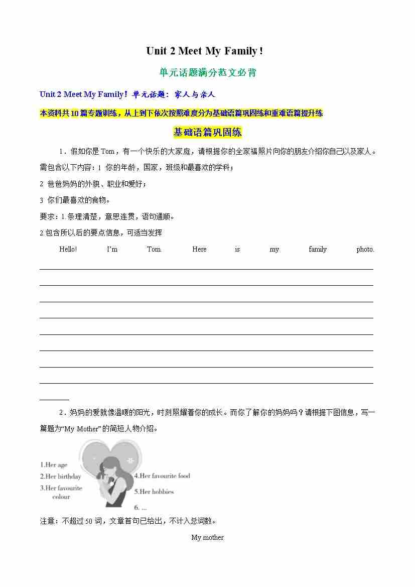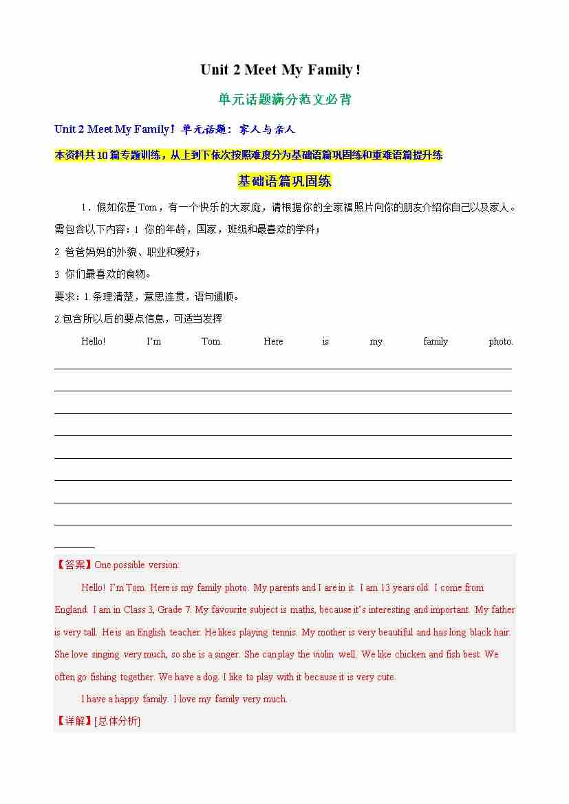 Unit 2 Meet My Family 单元话题满分范文必背(教师版)