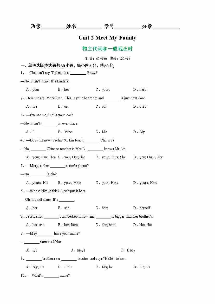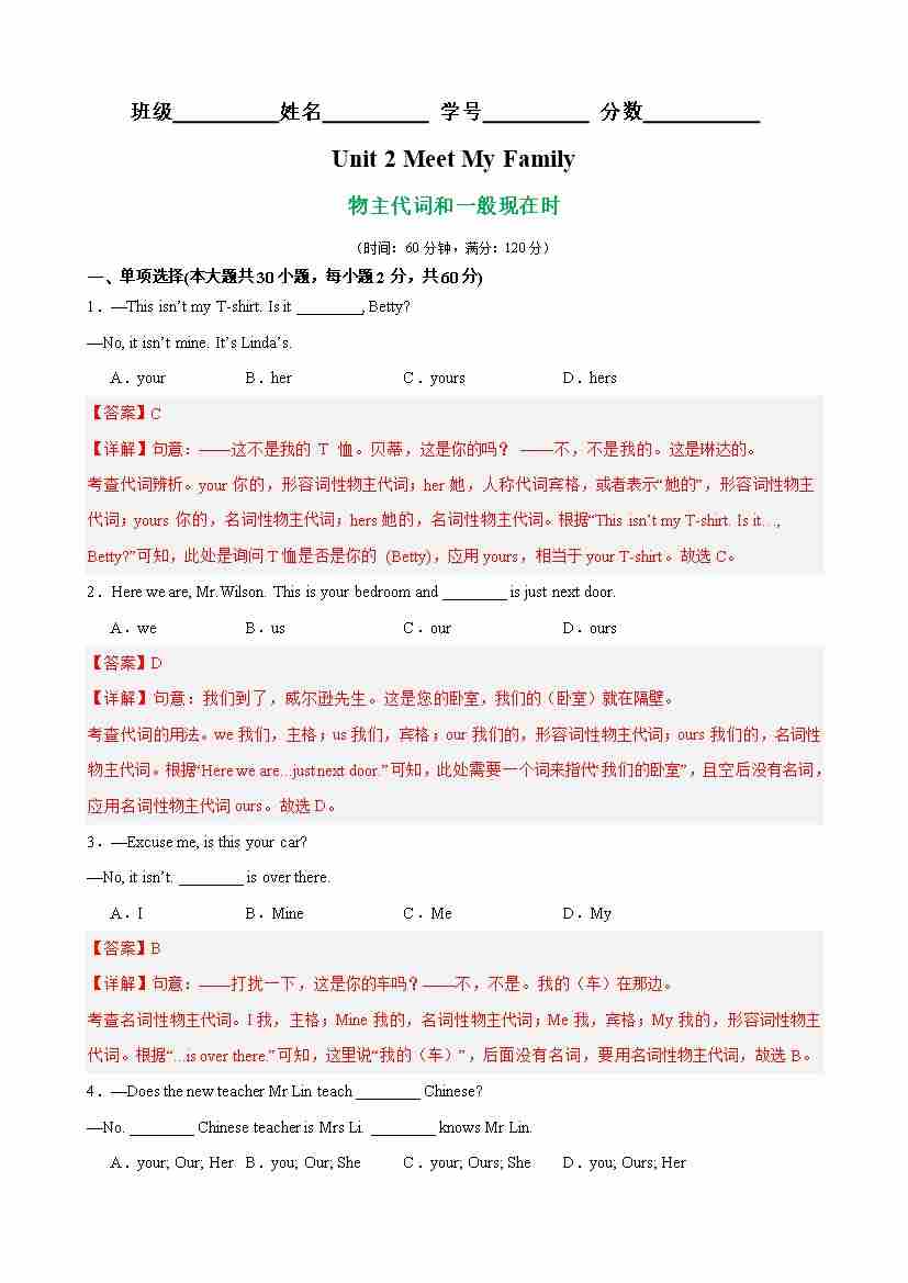 Unit 2 Meet My Family 语法Grammar 物主代词和一般现在时(教师版)