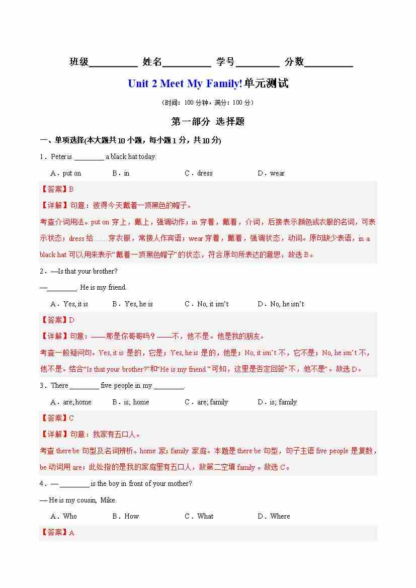 Unit 2 Meet My Family!单元测试(教师版)
