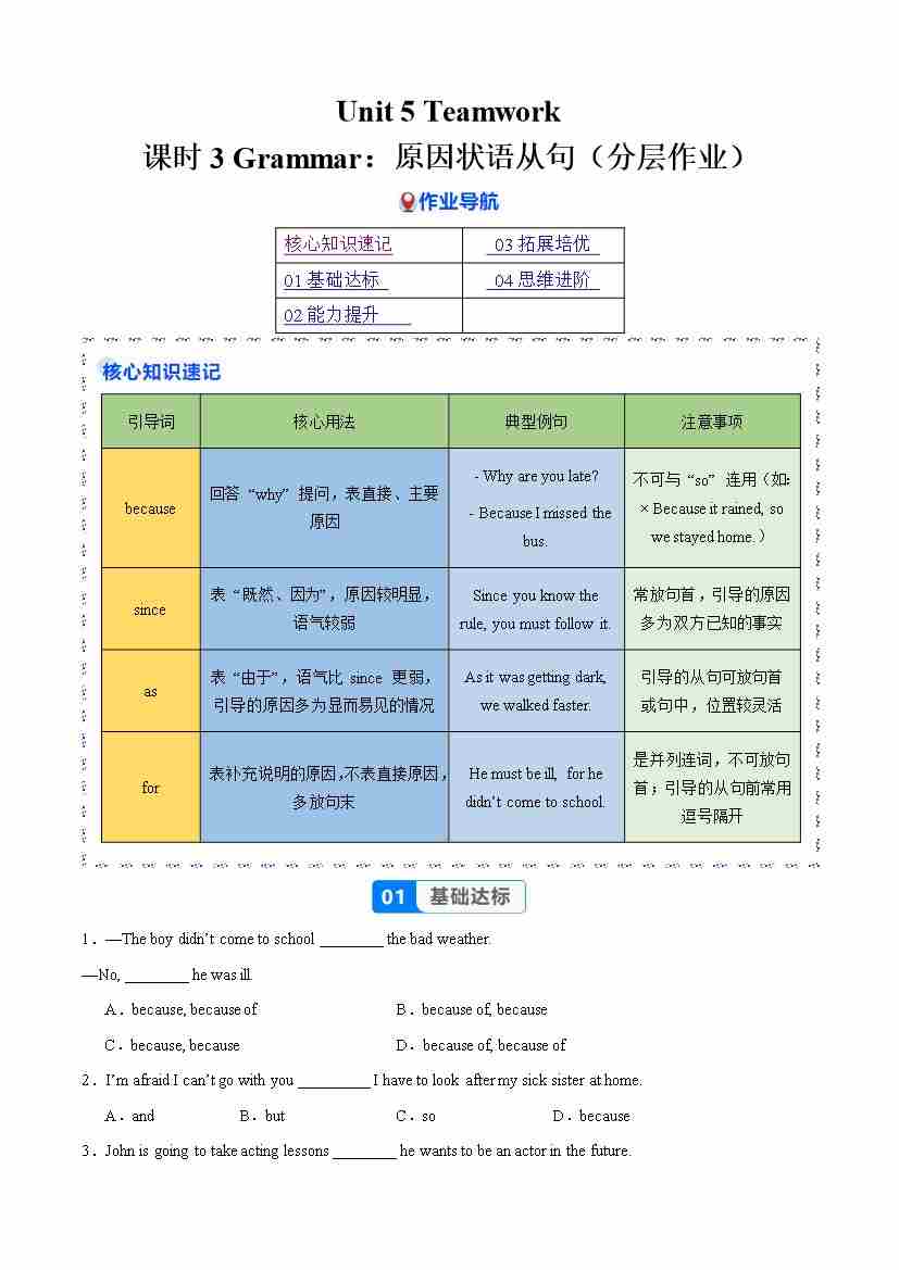 Unit 5 Teamwork 课时3 Grammar:原因状语从句(分层作业)(原卷版)