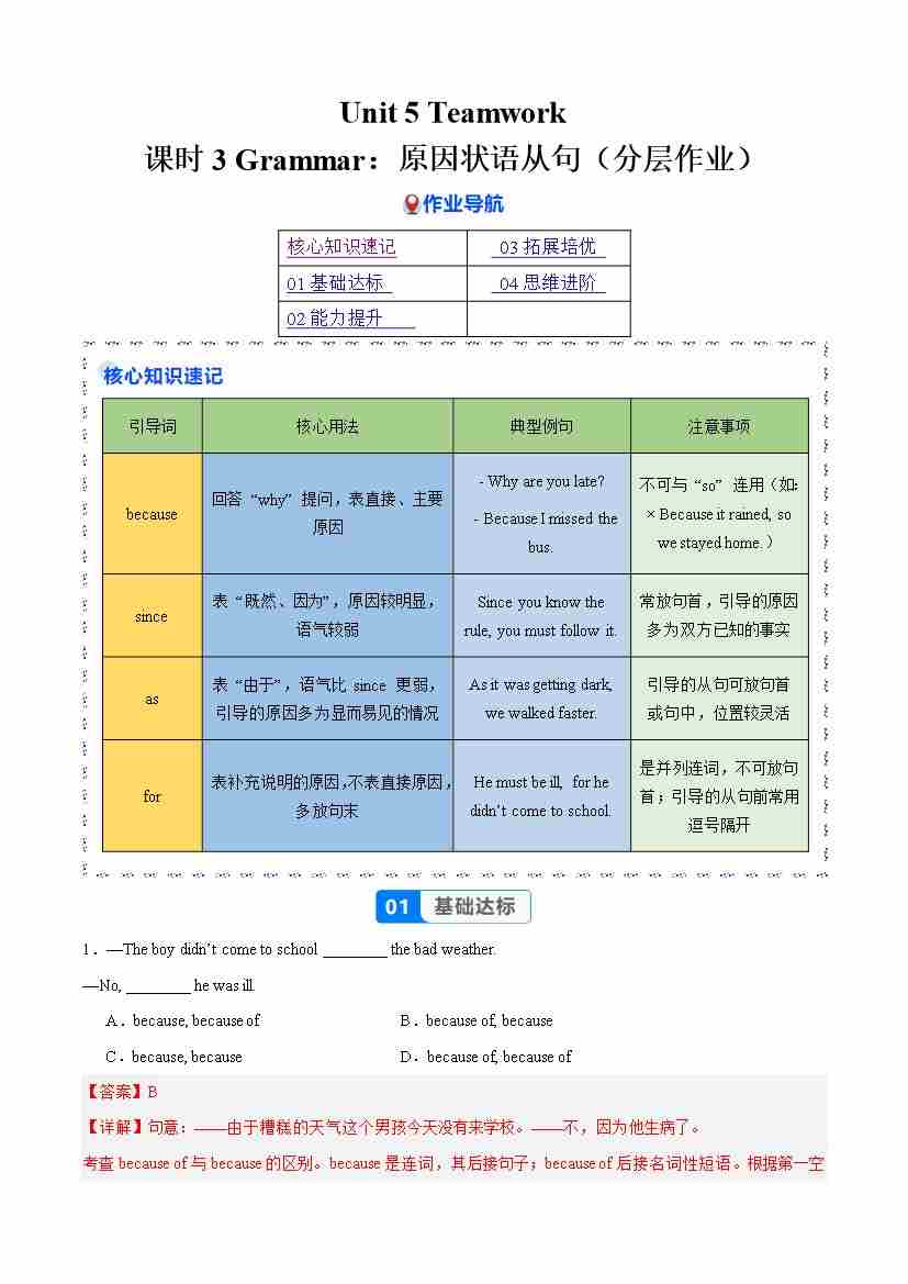 Unit 5 Teamwork 课时3 Grammar:原因状语从句(分层作业)(解析版)