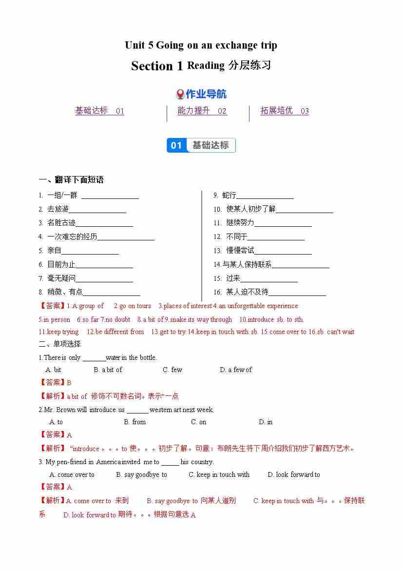Unit 5 课时1 Section 1 Reading(分层作业)(分层练习)(解析版)
