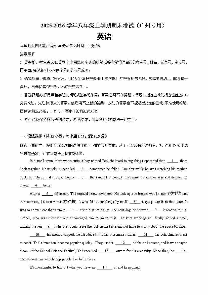 八年级英语上学期期末考试(广州专用)(原卷版)