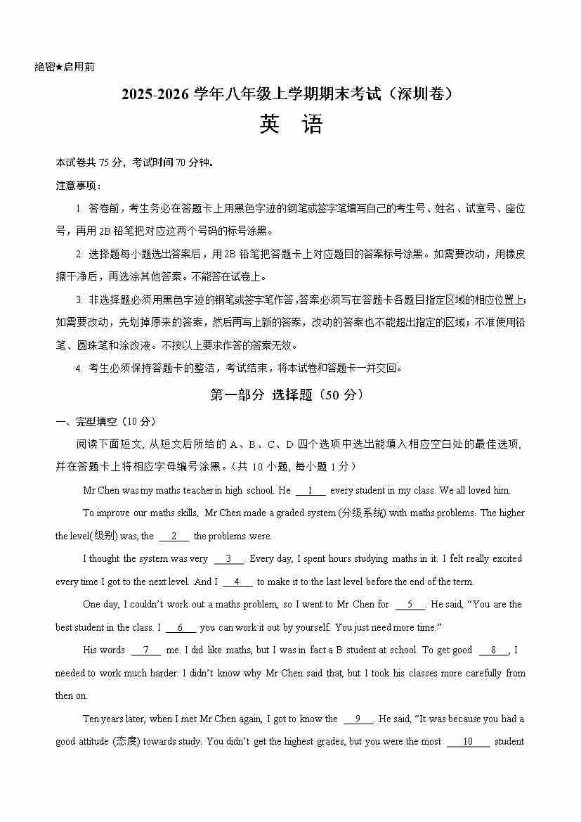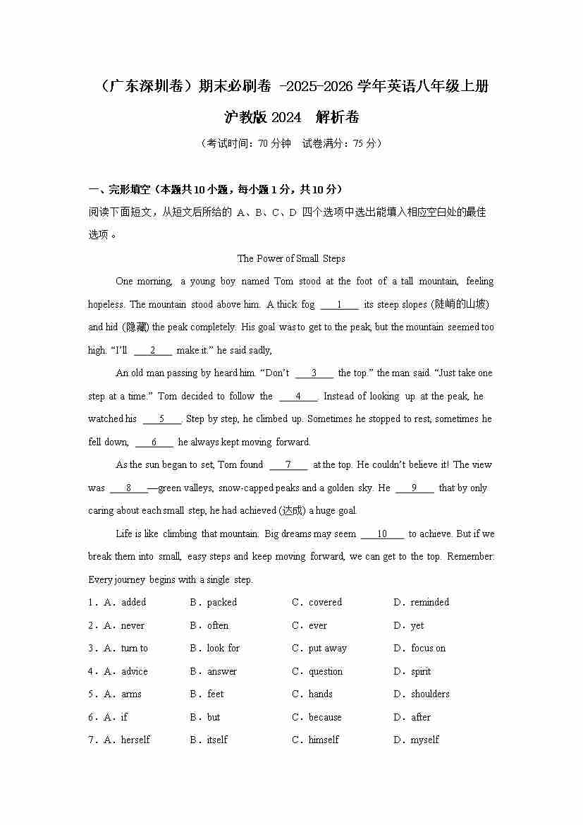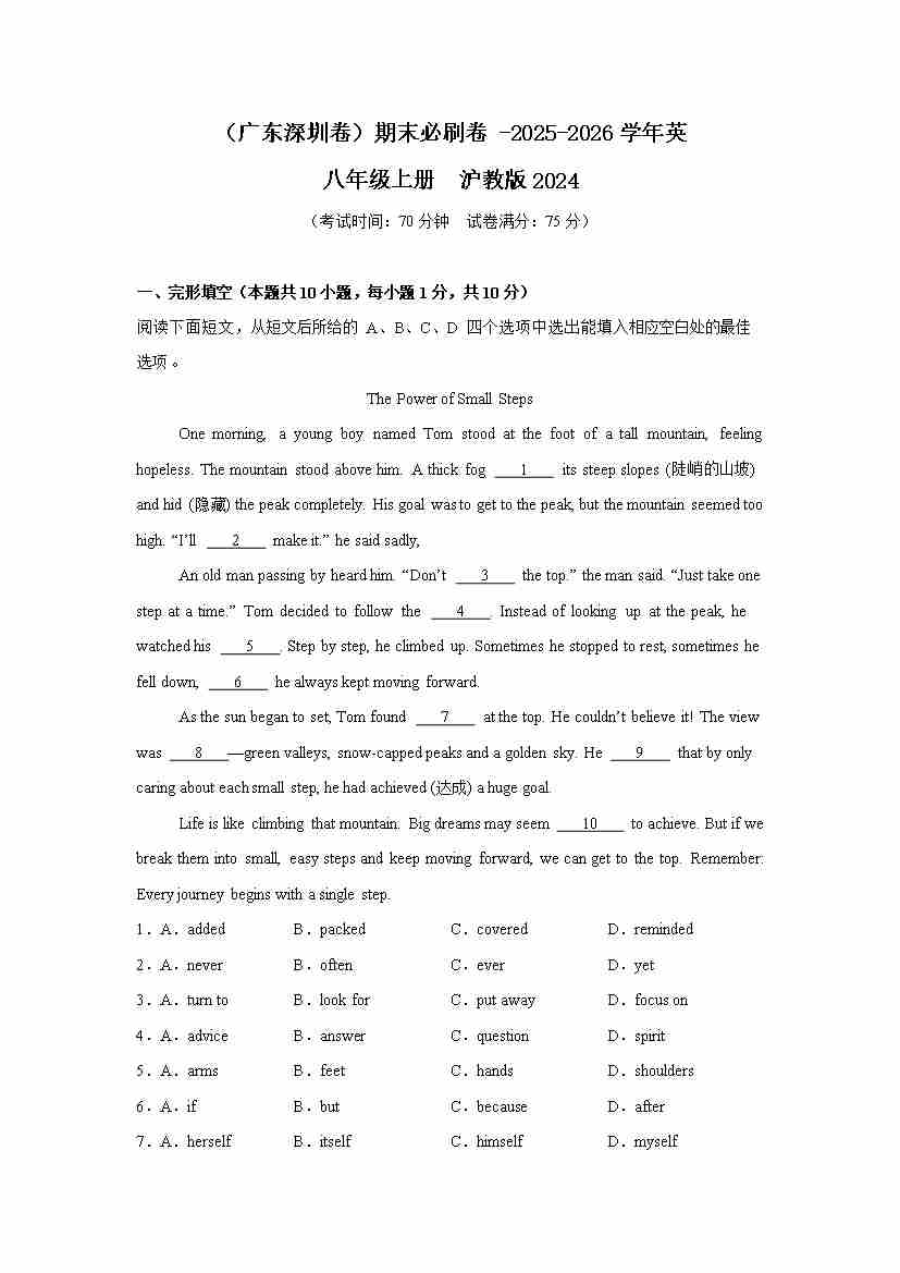 (广东深圳卷)期末必刷卷 -2025-2026学年英语八年级上册 沪教版2024 原卷