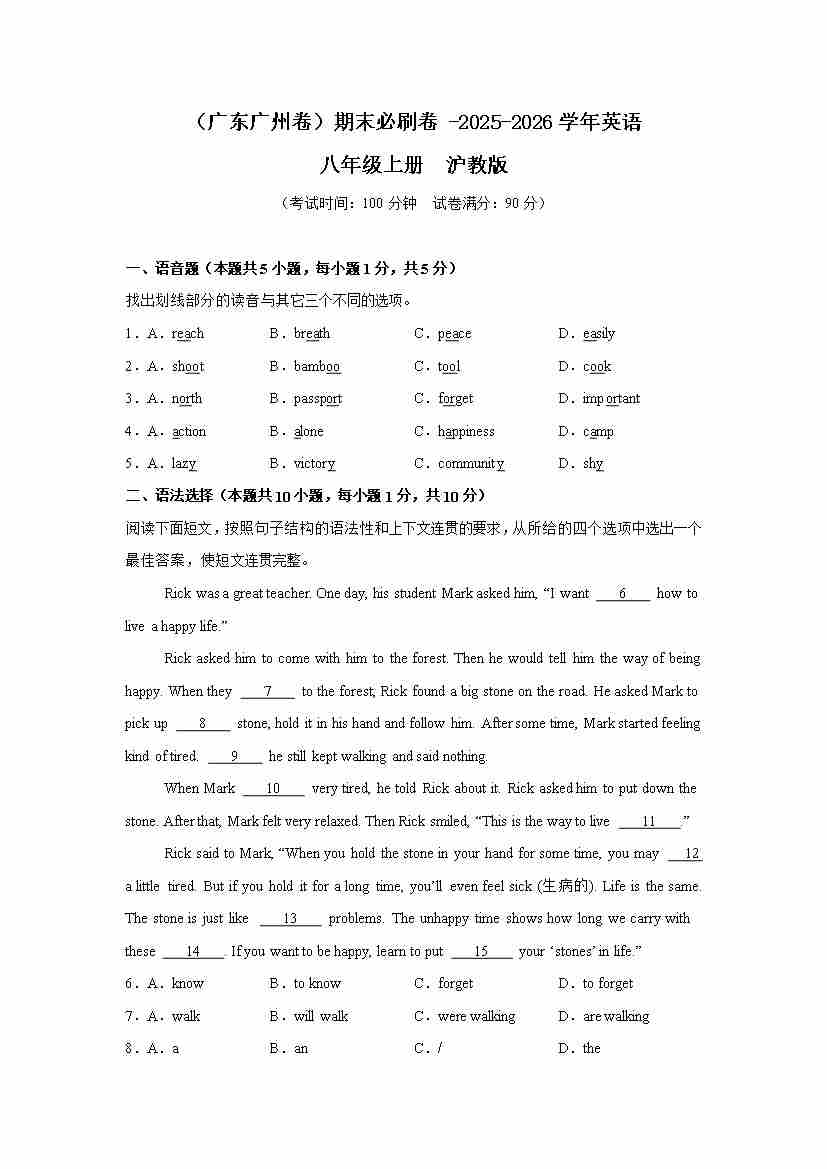 (广东广州卷)期末必刷卷 -2025-2026学年英语八年级上册 沪教版 原卷