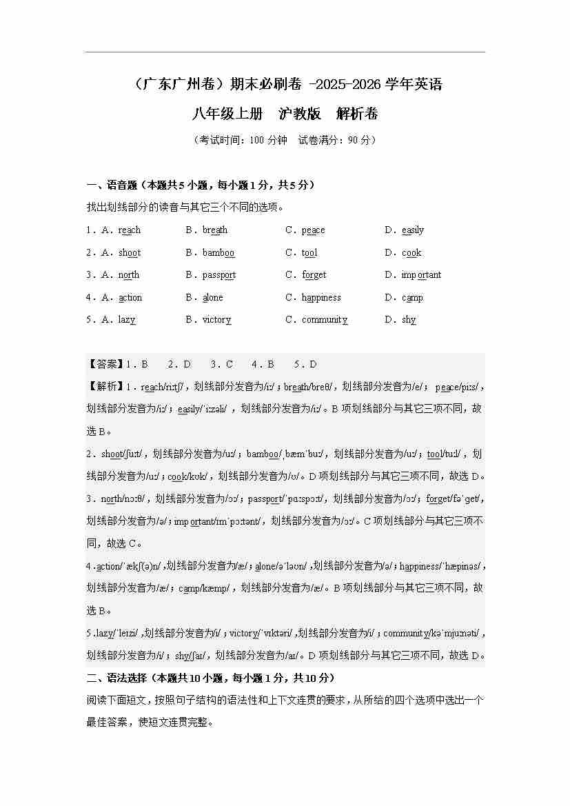 (广东广州卷)期末必刷卷 -2025-2026学年英语八年级上册 沪教版 解析卷
