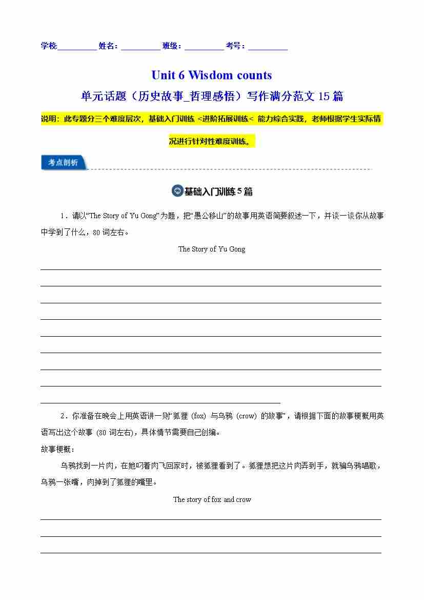 Unit 6 Wisdom counts 单元话题(历史故事_哲理感悟)写作满分范文15篇(教师版)