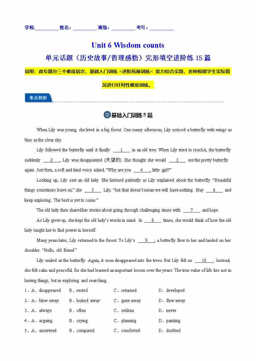 Unit 6 Wisdom counts 单元话题(历史故事_哲理感悟)完形填空进阶练15篇(学生版)