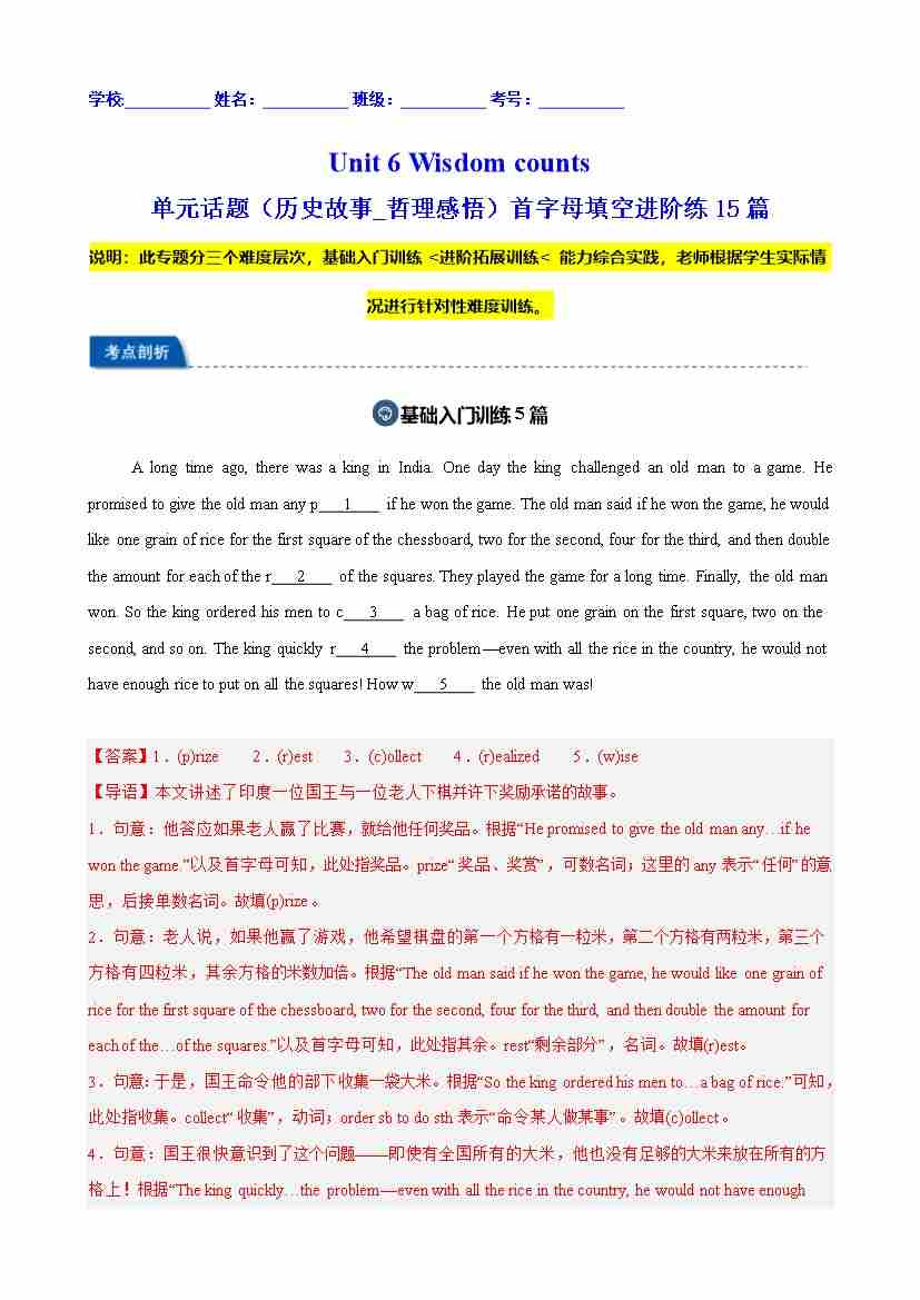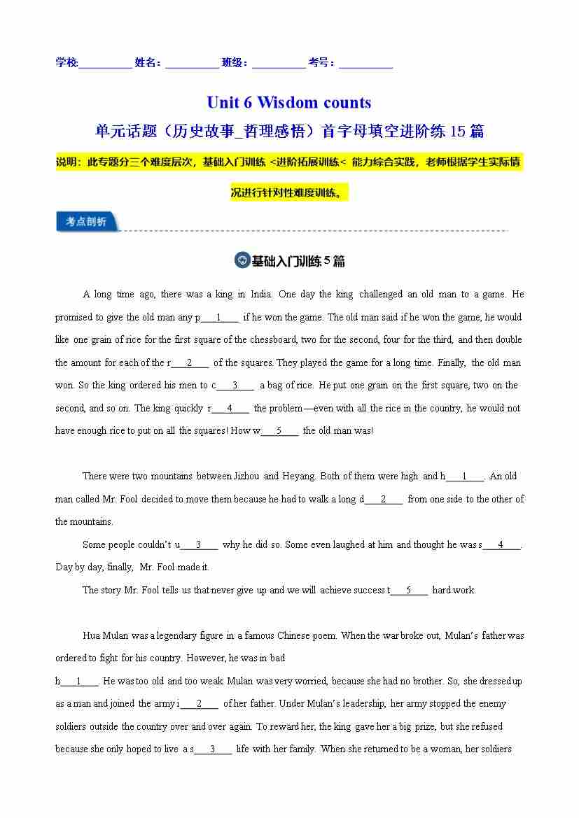 Unit 6 Wisdom counts 单元话题(历史故事_哲理感悟)首字母填空进阶练15篇(学生版)