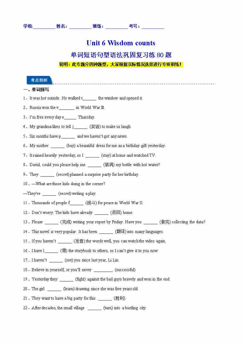 Unit 6 Wisdom counts 单词短语句型语法巩固复习练80题(学生版)