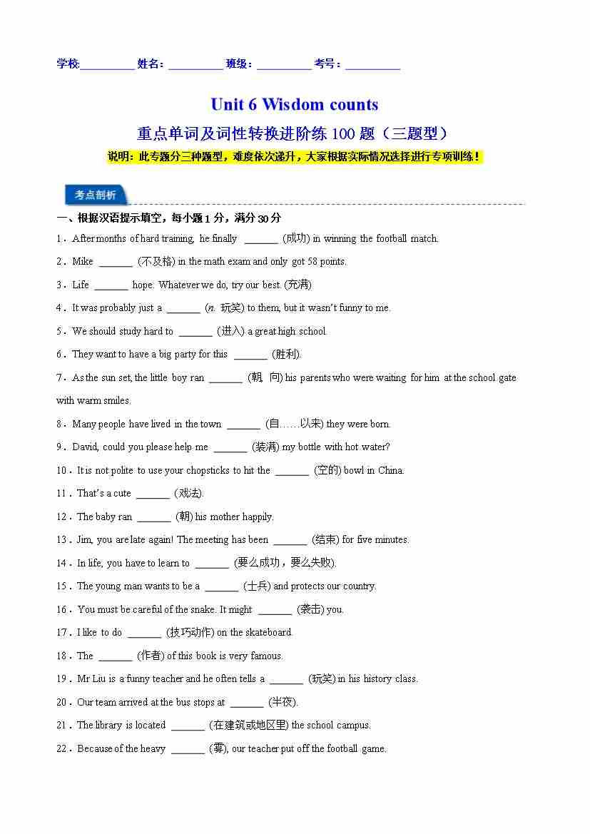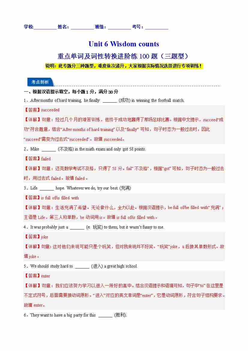 Unit 6 Wisdom counts 重点单词及词性转换进阶练100题(三题型)(教师版)