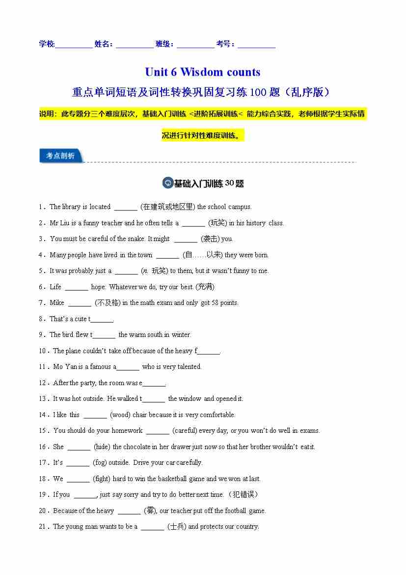 Unit 6 Wisdom counts 重点单词短语及词性转换巩固复习练100题(乱序版)(学生版)